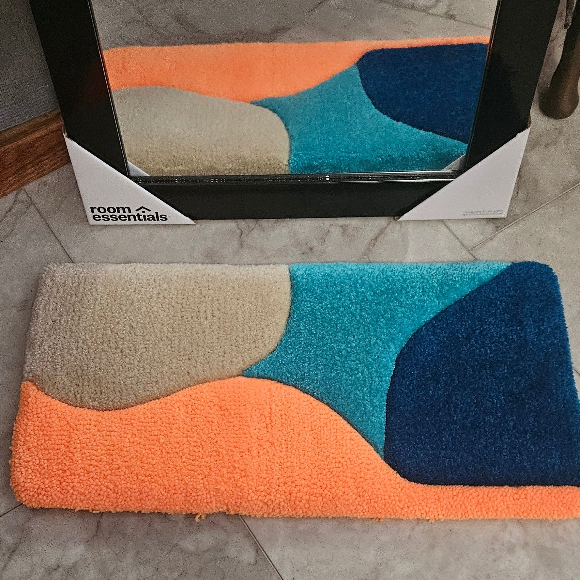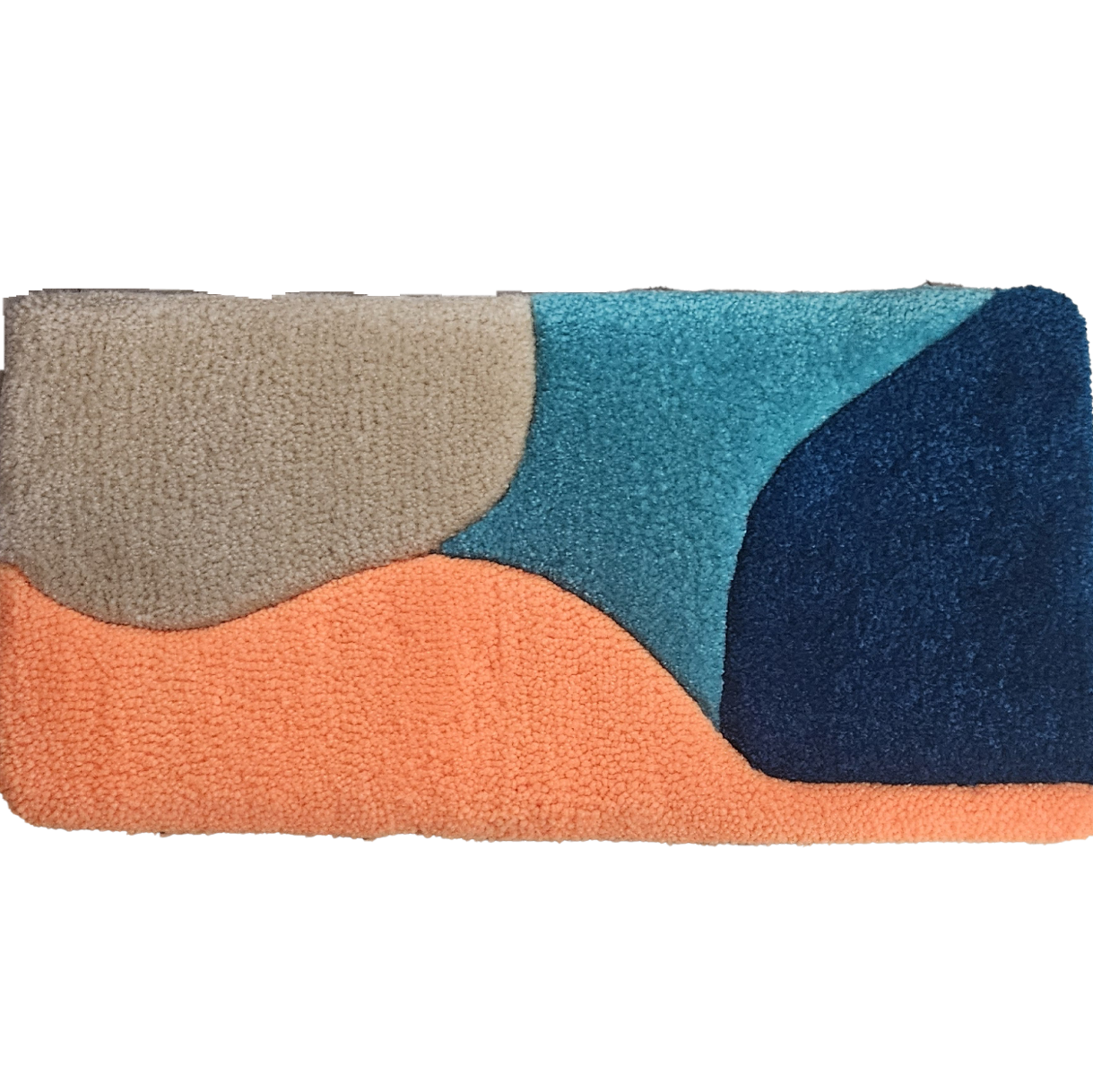 Blue, teal, orange, and tan, the colors of a coastline at golden hour, tufted and carved into a prayer mat built to hold you. No subject, just feeling. Lay it down, kneel, breathe. Let the warmth of it meet you where you are.